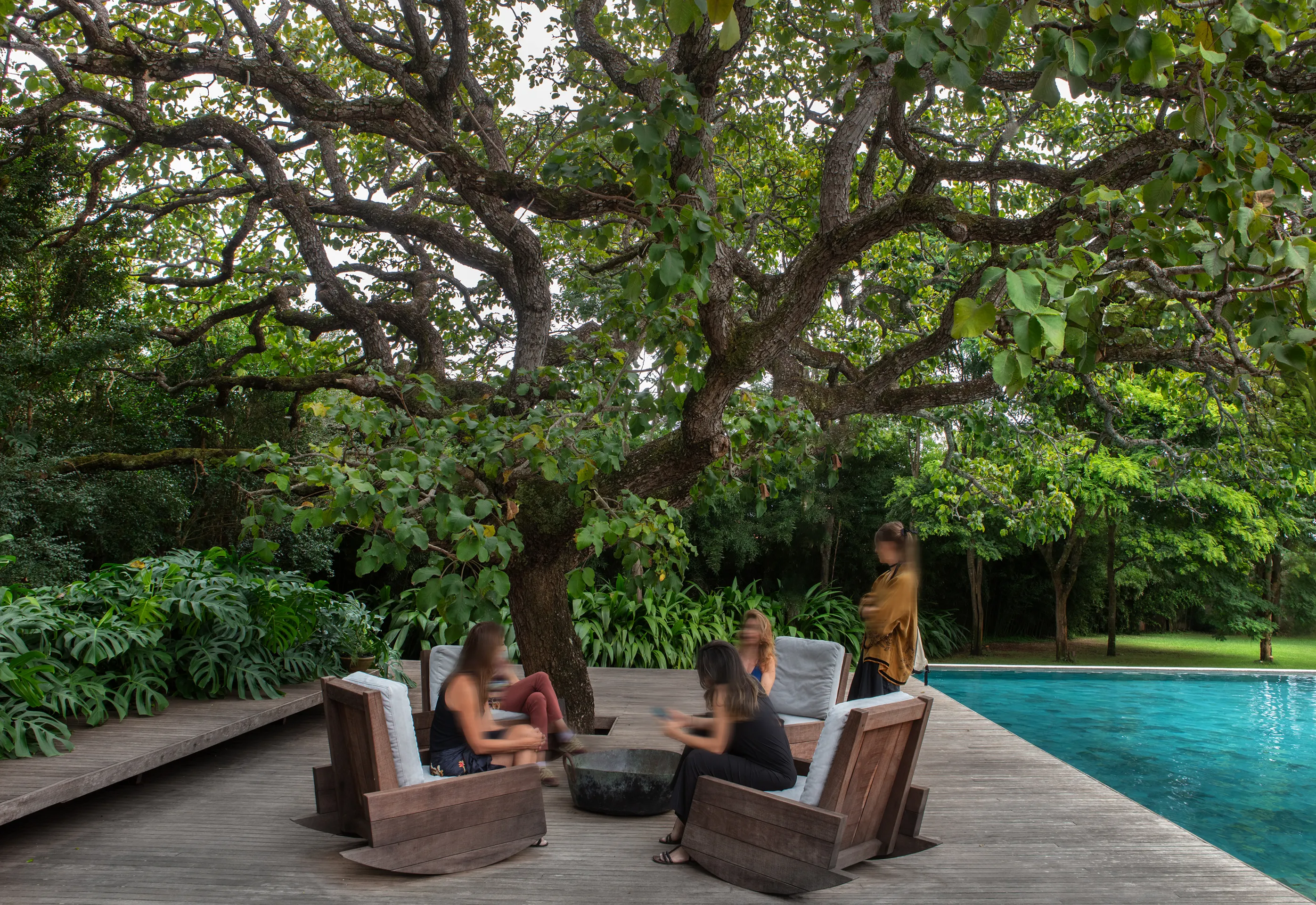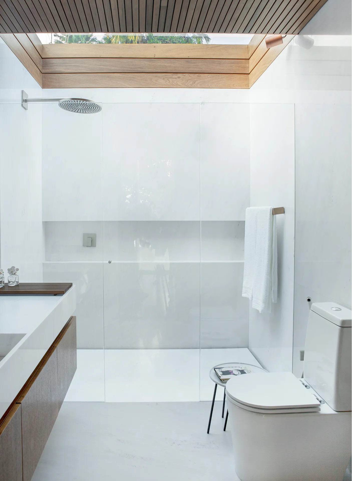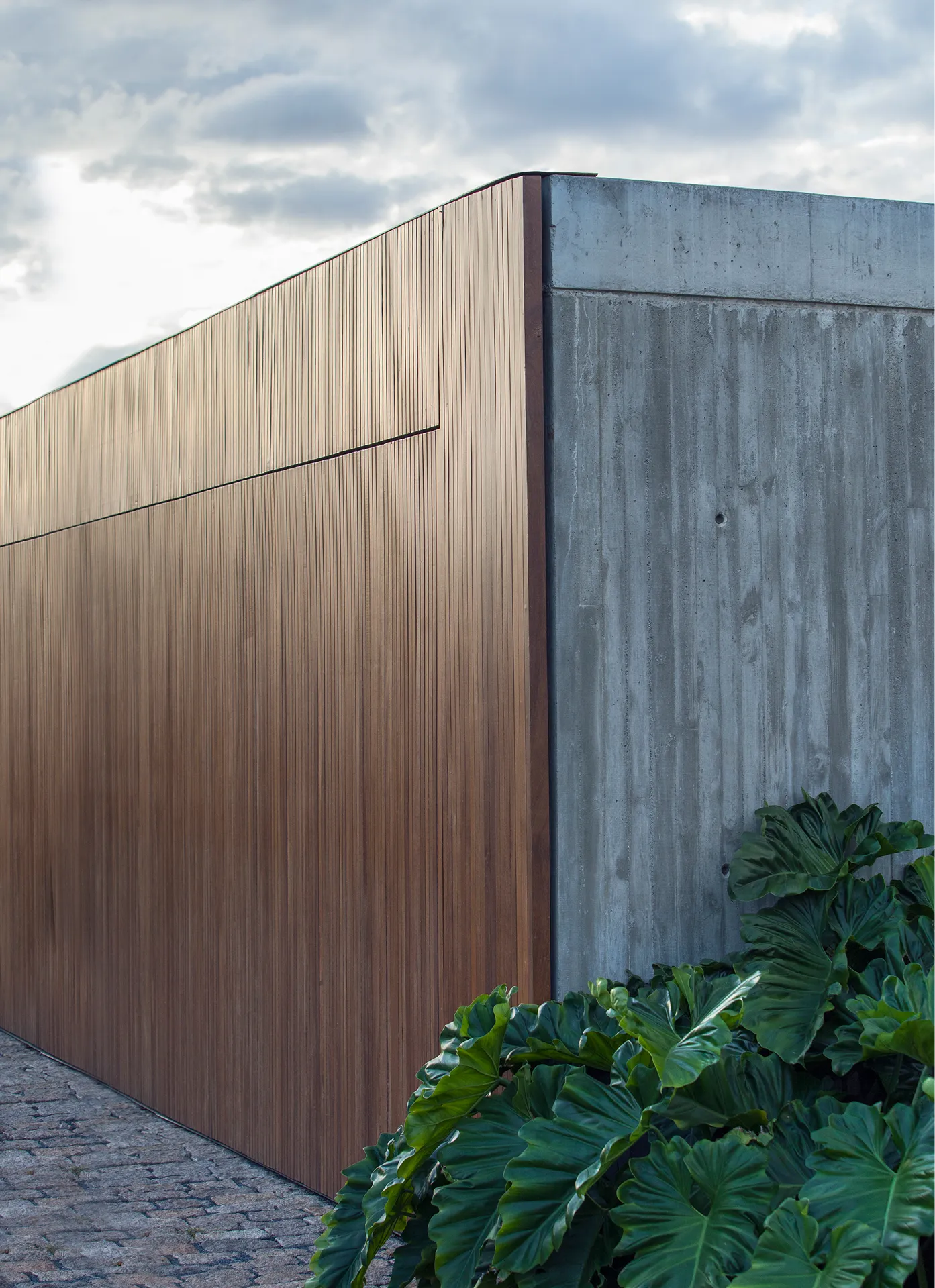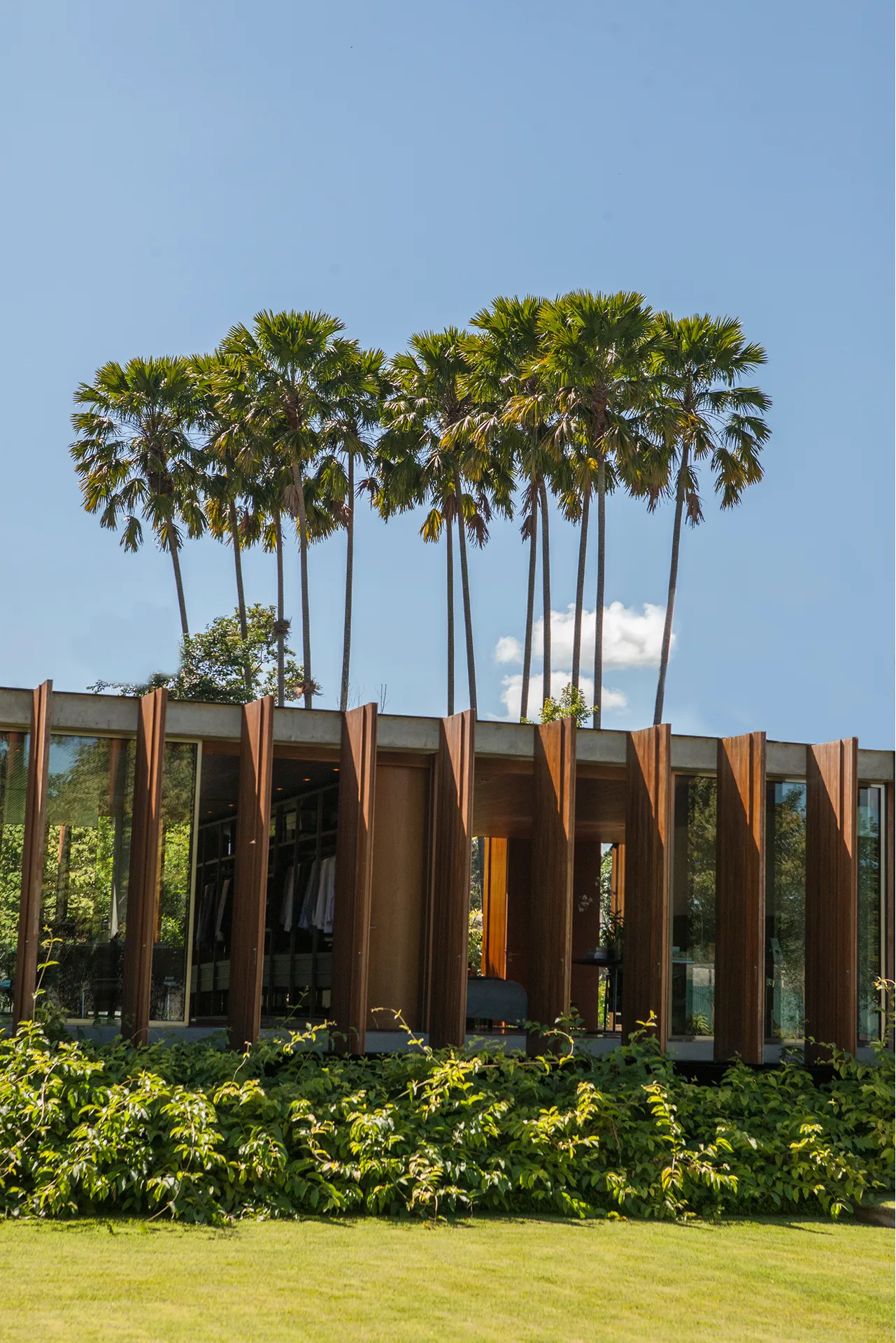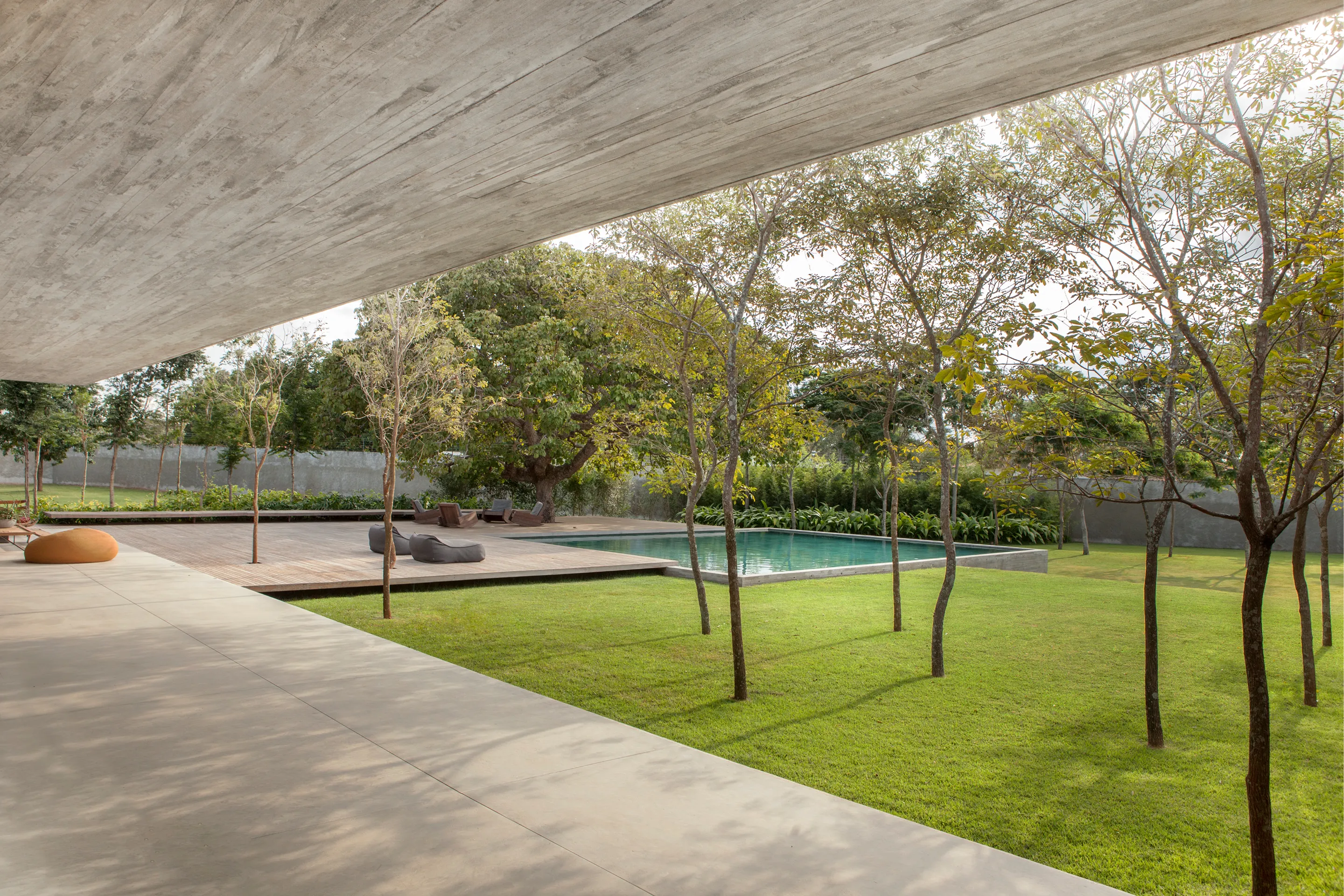 O entrelaçamento dos volumes ocorre através do encaixe dos blocos, laje com laje, deixando apenas o bloco central, destinado aos espaços sociais, aberto e integrado aos jardins. Ademais, a escolha do concreto aparente, que confere peso e estética à casa, contrasta com a leveza da laje do piso suspenso, um elemento planejado desde os primeiros esboços.