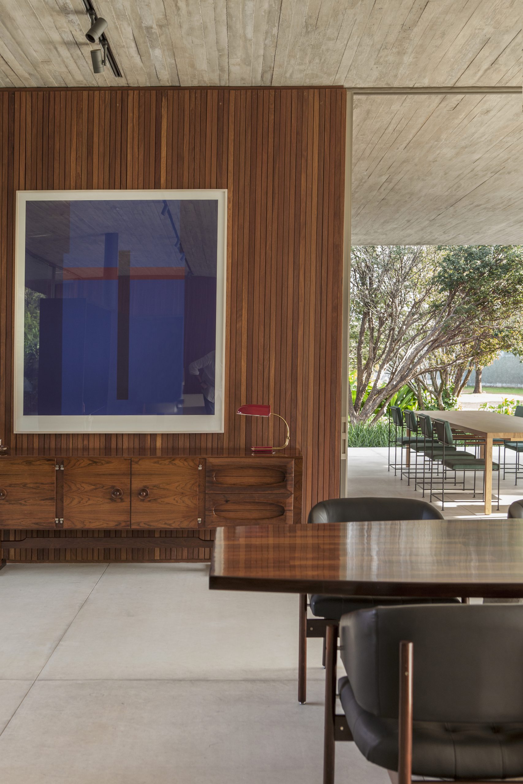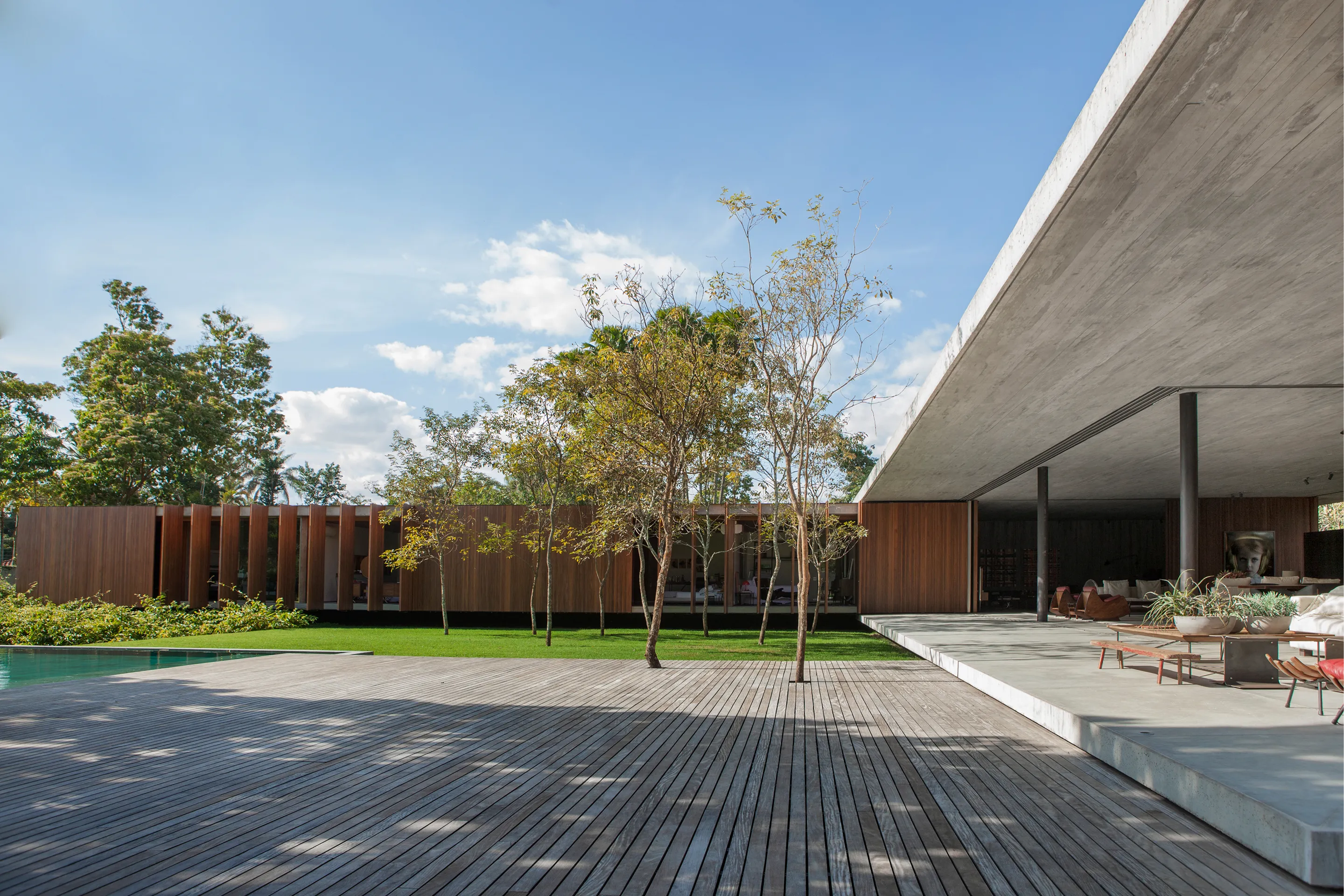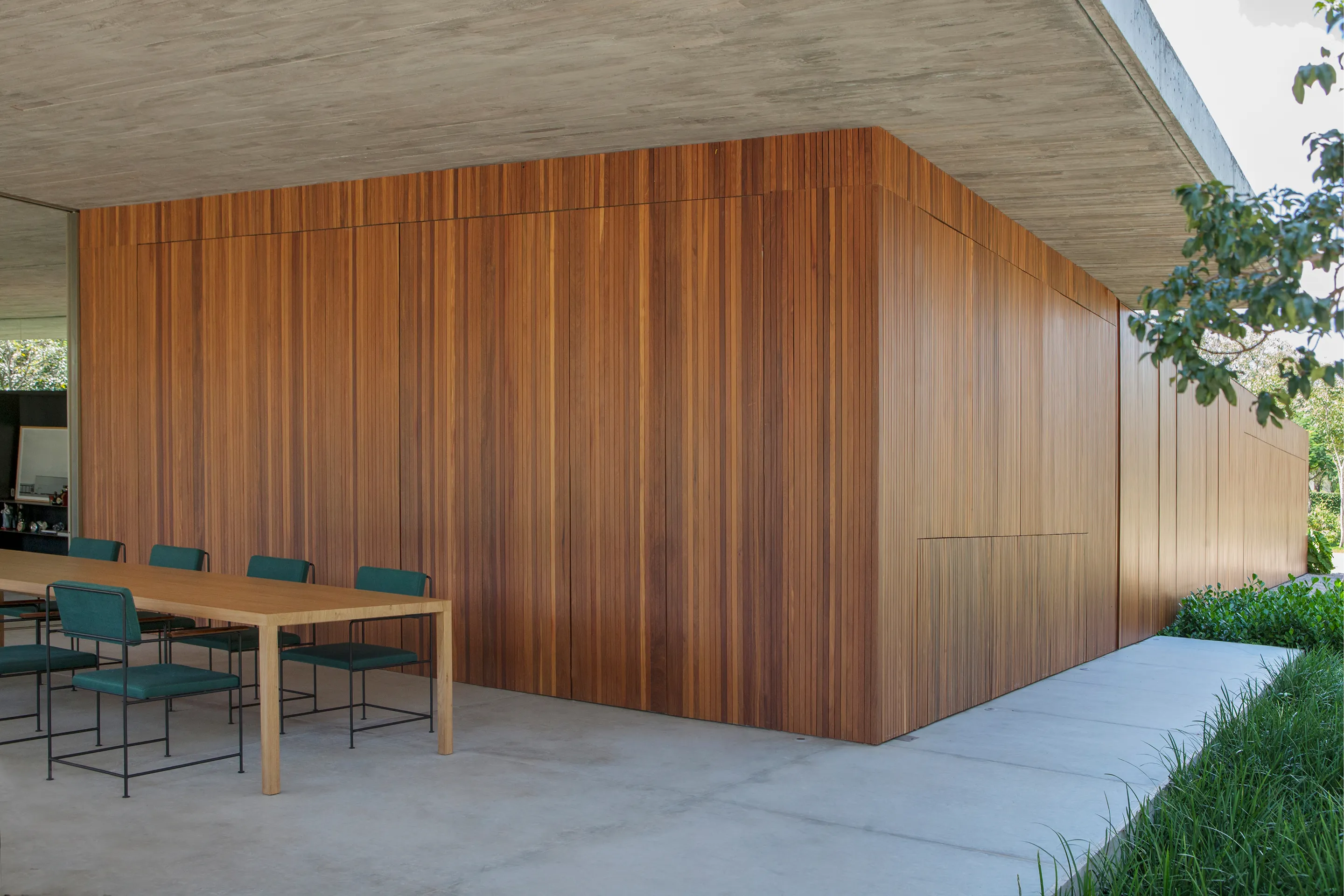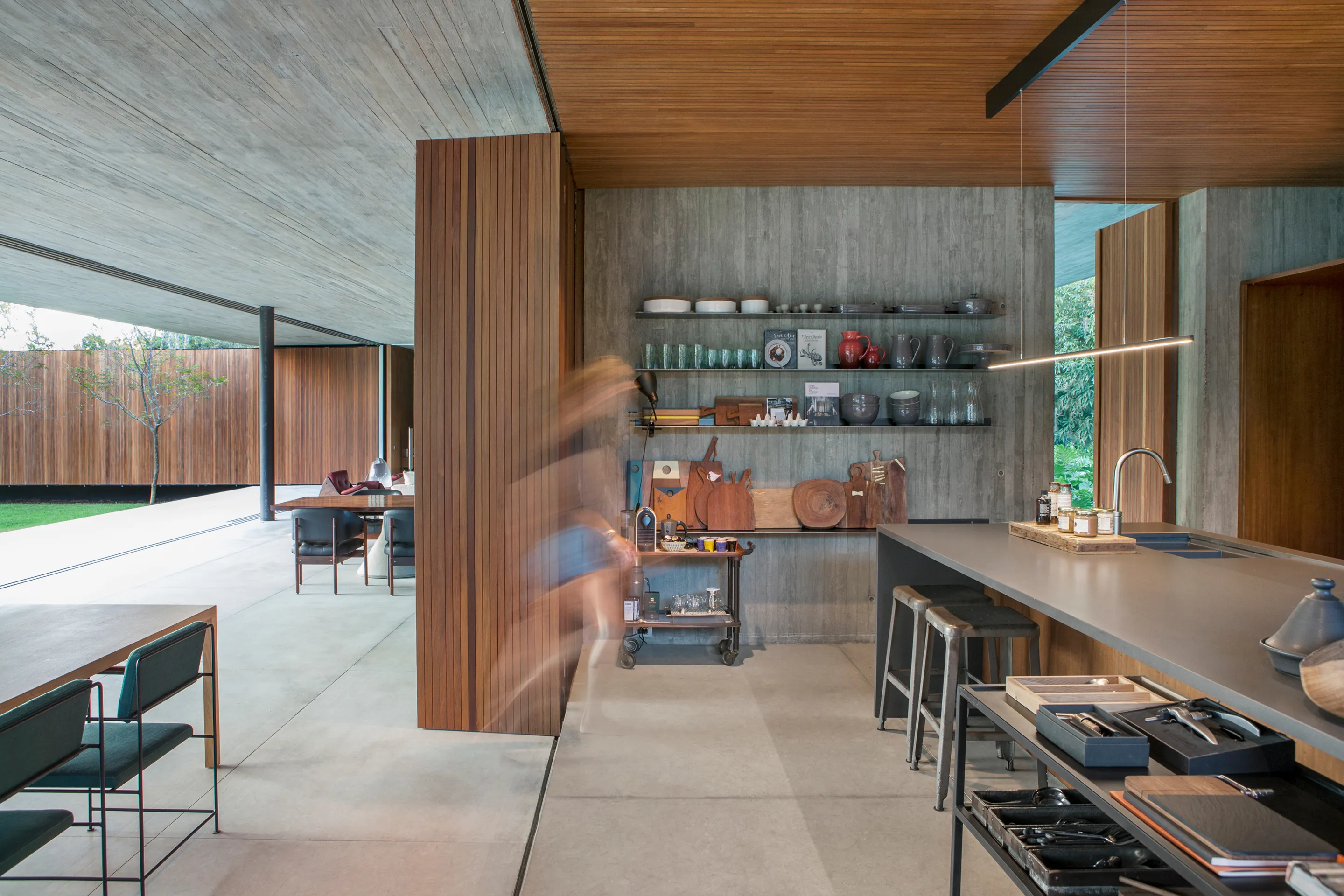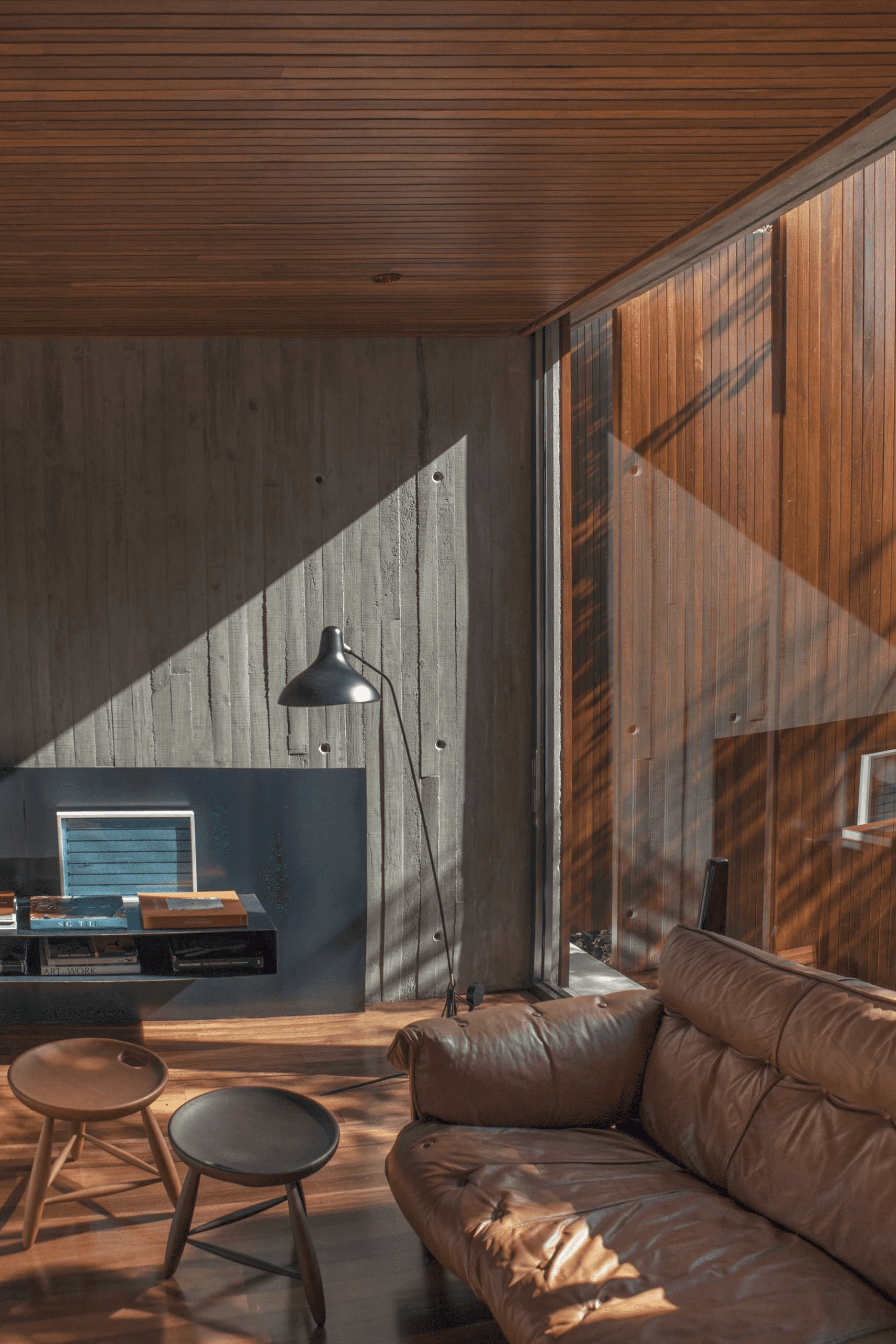 O uso de volumes com geometria pura permitiu que o projeto alcançasse uniformidade e racionalidade em seu layout, distribuindo a casa em três blocos principais: serviço, social e privativo. Além disso, o uso consistente de concreto e madeira proporcionou maior unidade ao desenho.